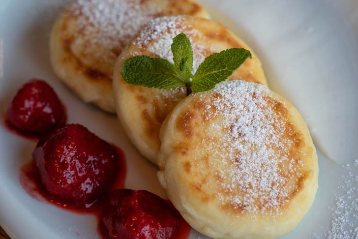 If you’re looking for something sweet, try out Lviv’s pride – the syrnyk cheesecake. Made from farmer’s cheese mixed with sugar and eggs, this dessert has a creamy texture topped with raisins.