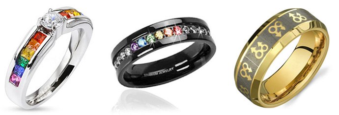 It's good to see gay wedding rings and engagement rings become increasingly popular among LGBT couples. They're usually pretty simple bands with a rainbow stripe across as an accent. When I married my husband back in 2010, there weren't such things - we looked every gay shop in London and all we found was either big flamboyant bling rings or butch Adonis Gladiator types (you know what I mean...) Or just plain, simple bands. I never would have imagined a touch of a rainbow could say so much more than "I'm married"... I'm queer, married to my man, and proud. A gay wedding rings are here with us.
