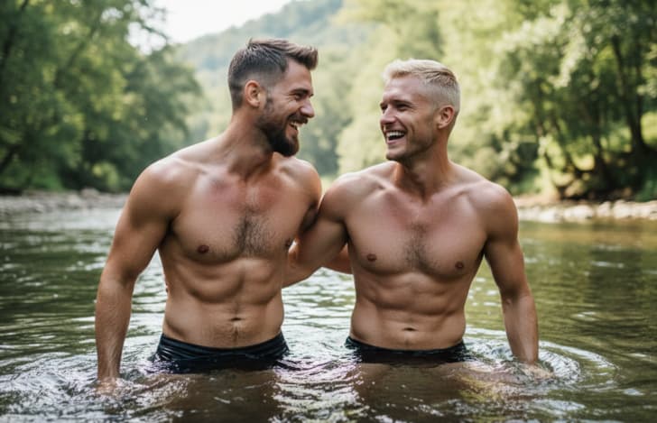 He surfaces nearby, water streaming down his chest as he shakes it off like a dog. You swim out deeper, the bottom dropping away until legs kick in nothing. Sun beats down hot on your backs while the depths stay icy, that contrast hitting every nerve. No towels wait on shore, no plan for drying off - just the drip and the breeze when you climb out later. This plunge strips everything down to skin and breath.