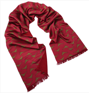 Double-sided silk scarf with pheasant design. 150cm x 25cm (excluding tassels). The wine colour will give a great accent on a grey or navy coloured suit.