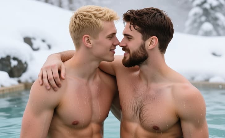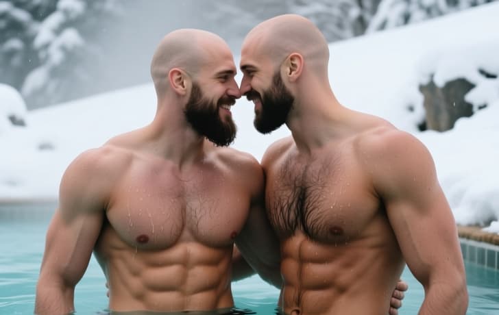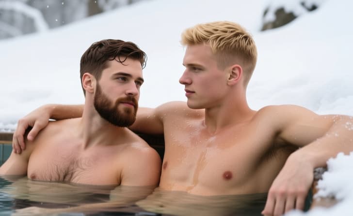 Every moment spent in this liquid heat transforms into a memory of intense physical presence. Nature dictates the terms of your interaction as the minerals work their magic on your tired limbs. This escape is a tribute to the power of heat and the beauty of the male form in its natural state. Equilibrium returns to your spirit as you surrender to the warmth of the spring and the company of a strong partner.